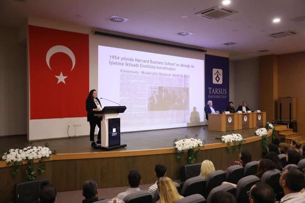 Prof. Dr. Burcu Adiloğlu, a faculty member at Istanbul University, gave a presentation on the historical development of the case method. Adiloğlu shared examples of the use of business cases in education, highlighting the contributions of Mustafa Aysan, a Harvard University graduate from Tarsus, to the field of case studies.