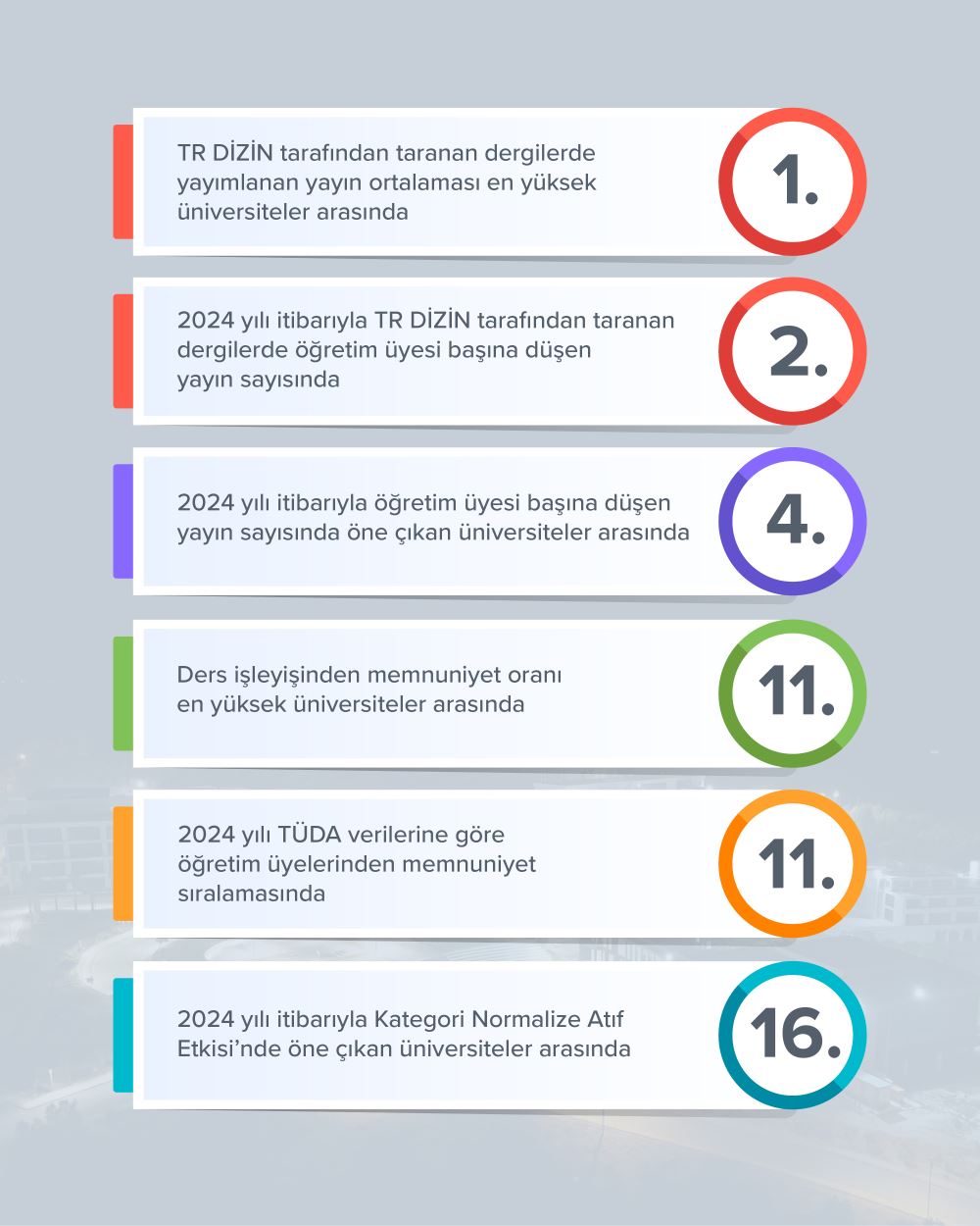 Ders işleyişinden memnuniyet oranı en yüksek üniversiteler arasında 11’inci sırada yer alan Tarsus Üniversitesi, 2024 yılı TÜDA verilerine göre öğretim üyelerinden memnuniyet sıralamasında da 11’inci sıraya yükseldi. Üniversitemiz bilimsel etkiyi gösteren kategori normalize atıf etkisinde öne çıkan üniversiteler arasında 16’ncı sıraya yerleşti.