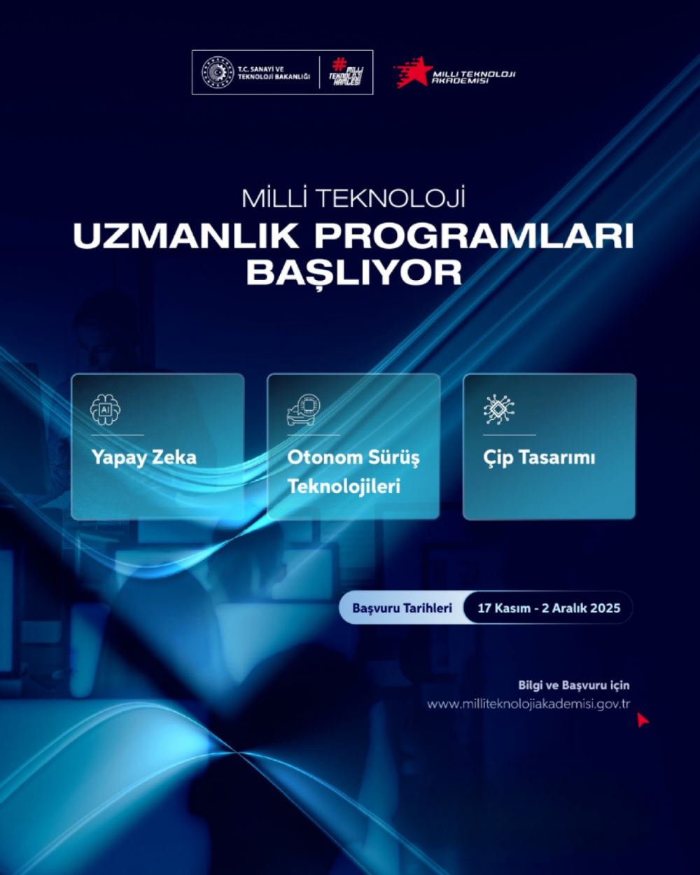 T.C. Sanayi ve Teknoloji Bakanlığı tarafından Milli Teknoloji Hamlesi çalışmaları doğrultusunda, ülkemizin teknoloji sektörlerinin ihtiyaç duyduğu nitelikli insan kaynağının yetiştirilmesine katkı sunmak amacıyla Milli Teknoloji Uzmanlık Programları Yapay Zekâ, Otonom Sürüş Teknolojileri ve Çip Tasarımı olmak üzere 3 alanda hayata geçirilmiştir.