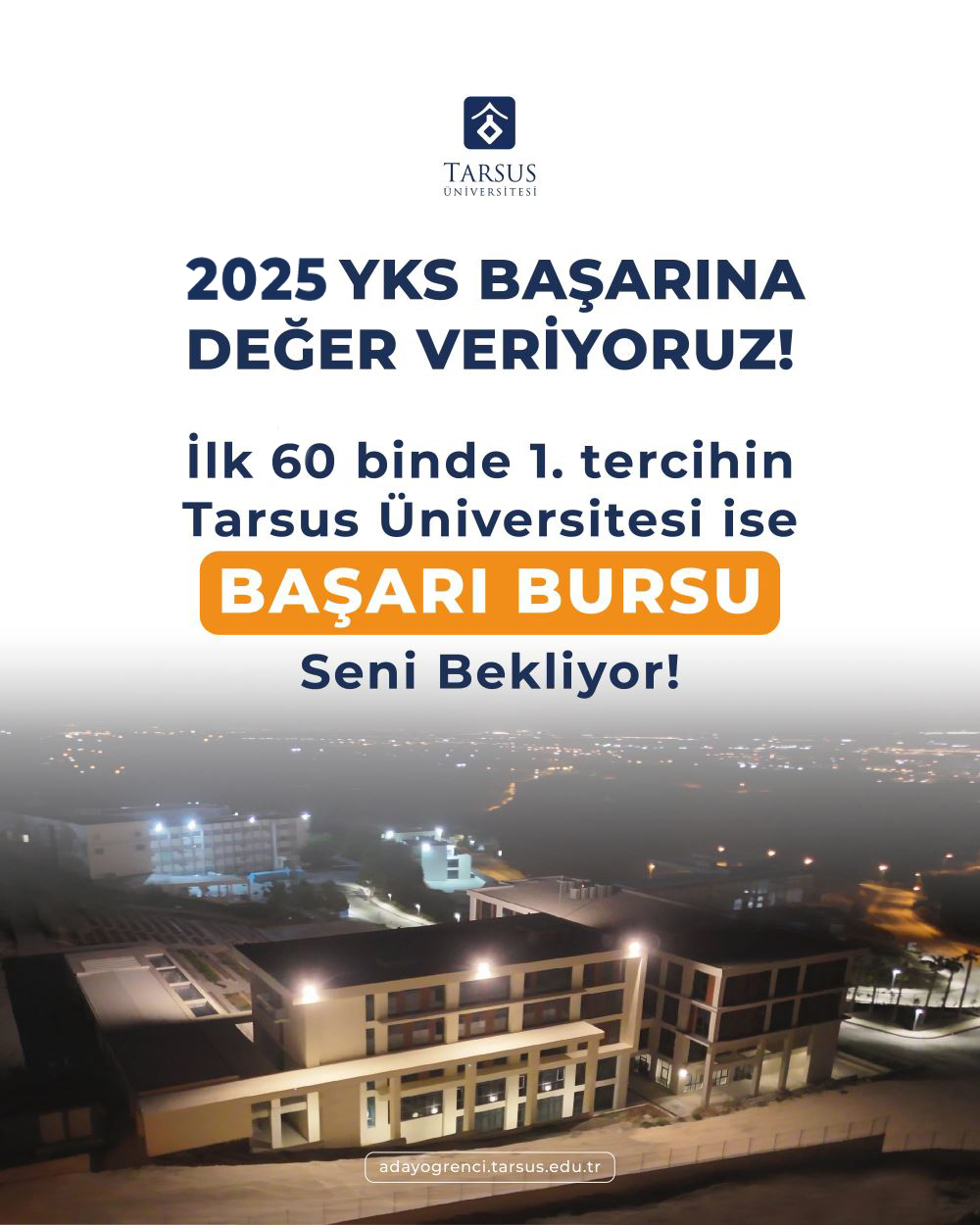 2025 YKS (Yükseköğretim Kurumları Sınavı) sonucunda ilk 60 bine girerek Tarsus Üniversitesini ilk sırada tercih eden ve kayıt yaptıran lisans programı öğrencilerine "Başarı Bursu” verilecektir.