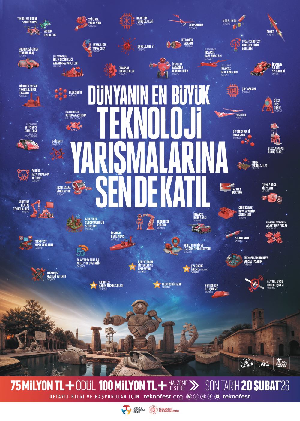 30 Eylül-4 Ekim 2026 tarihleri arasında GAP Havalimanı’nda düzenlenecek olan TEKNOFEST, her yıl yenilenen yarışma kategorileriyle birlikte Türkiye’nin en büyük ödüllü teknoloji yarışmalarına ev sahipliği yapmaya devam edecektir.