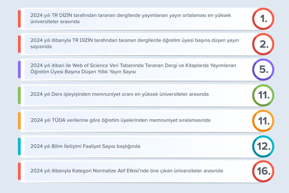 Raporda 2024 TR DİZİN kapsamındaki dergilerde yayımlanan yayın ortalaması en yüksek üniversite olarak 1’inci sırada yer aldı. Akademik üretkenlik göstergelerinde ise Tarsus Üniversitesi; TR DİZİN tarafından taranan dergilerde öğretim üyesi başına düşen yayın sayısında Türkiye genelinde 2’nci sırada yer aldı. Ayrıca Web of Science veri tabanında taranan dergi ve kitaplarda yayımlanan öğretim üyesi başına düşen yıllık yayın sayısı açısından 5’inci sıraya yerleşti.